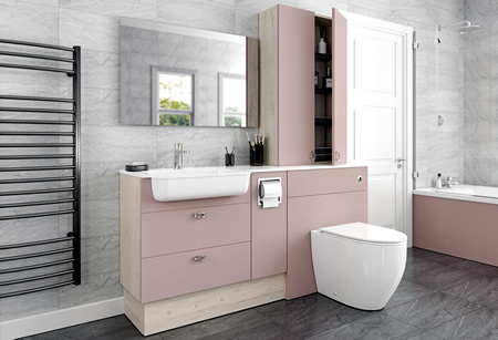 Alba fitted bathroom furniture is designed so units fit flush together to give a streamlined look. Featuring units in 'on-trend' decors complete with the convenience of doors and colour co-ordinating cabinets assembled in one box for ease of installation. All units have stylish chrome handles. Finish the look with a selection of slim worktops to complement your look. Read more »